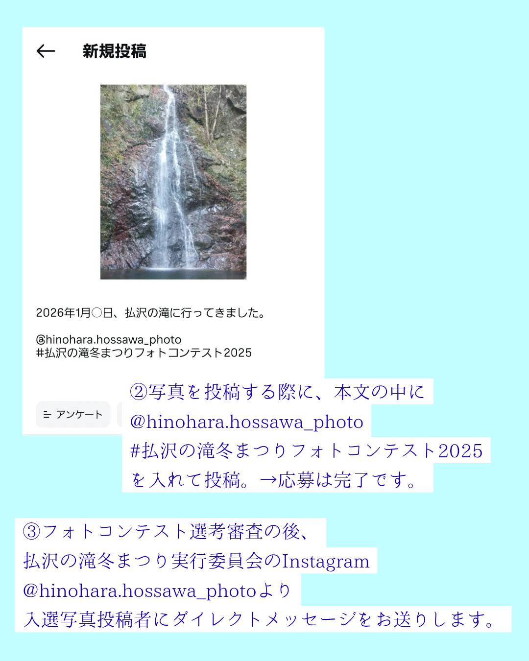 応募先は、〒190-0212 東京都西多摩郡檜原村上元郷403 檜原村観光協会事務局 払沢の滝冬まつり 氷瀑クイズ係 です。